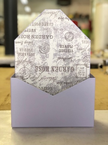 Картонная коробка для цветов в форме конверта . Цвет:Светло серый. Розница 400 рублей .